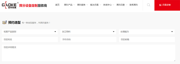 利用互聯(lián)網(wǎng)平臺,高科機械還推出在線預(yù)約選型服務(wù),您只需要打開高科機械官網(wǎng),在高科服務(wù)一欄中找到預(yù)約選型服務(wù),即可在線填寫設(shè)備使用的產(chǎn)品類別、加工物料種類及處理能力等信息,留下聯(lián)系方式后,我們的工作人員會在兩個工作日內(nèi)回復(fù),為您提供科學(xué)合理的選型方案。